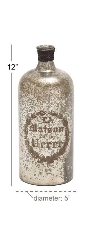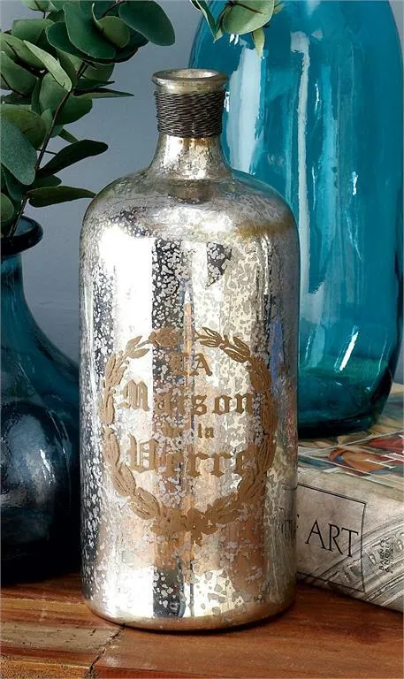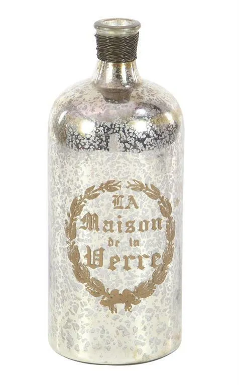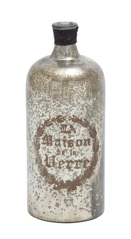These pieces are designed to offer any farmhouse or country cottage themed home a final touch. glass, iron Distressed metallic silver, brown, black Can be displayed on your shelf or mantelpiece 12" Old World Charm painted mottled glass "La Maison de la Verre" bottle, distressed metallic silver paint with gray speckles, brown typography and flourishes with braided iron wire-wrapped neck
