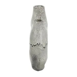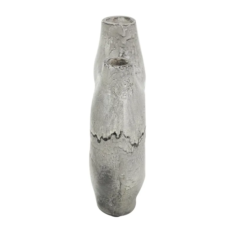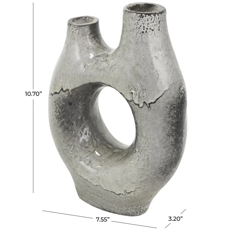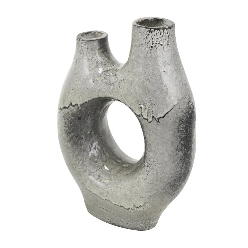- The asymmetrical shape, double opening, and cutout design add an artistic flair to the polished gray vase for faux flowers
