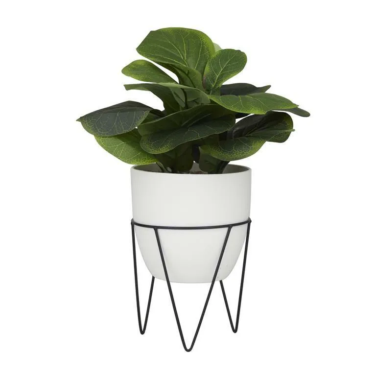 - Green plant decor accentuates a rounded planter with hairpin leg stands