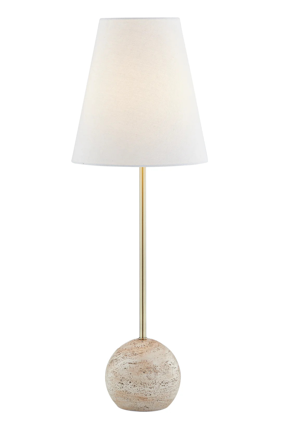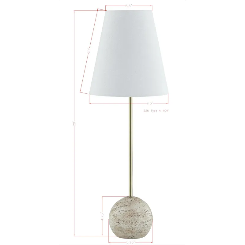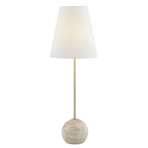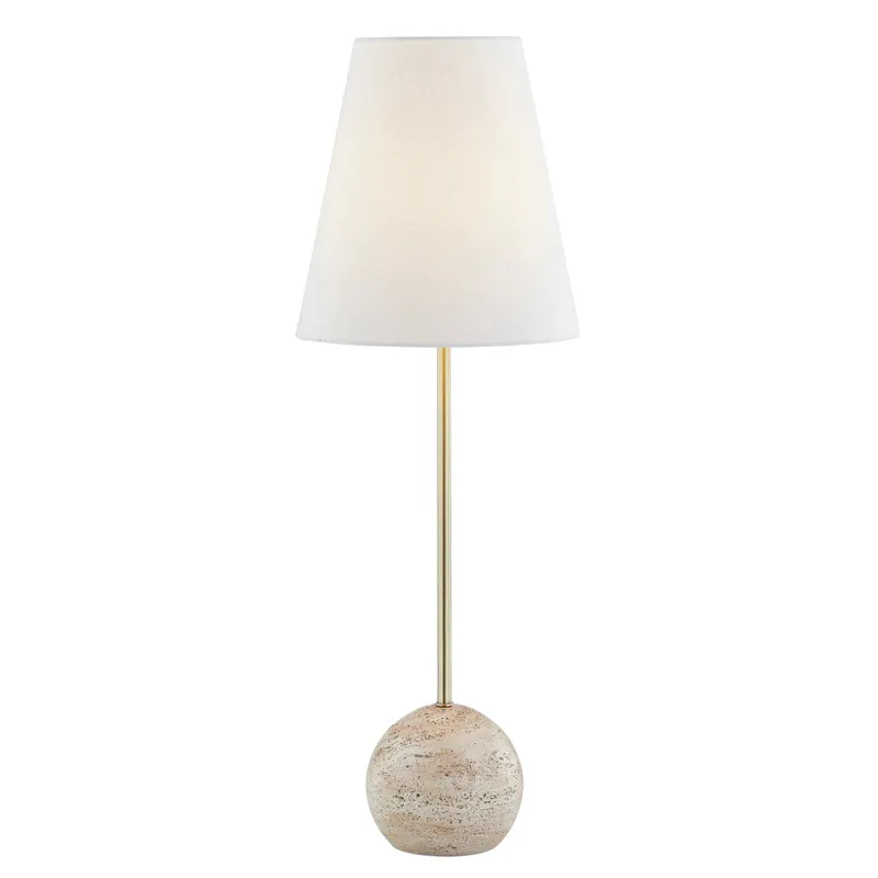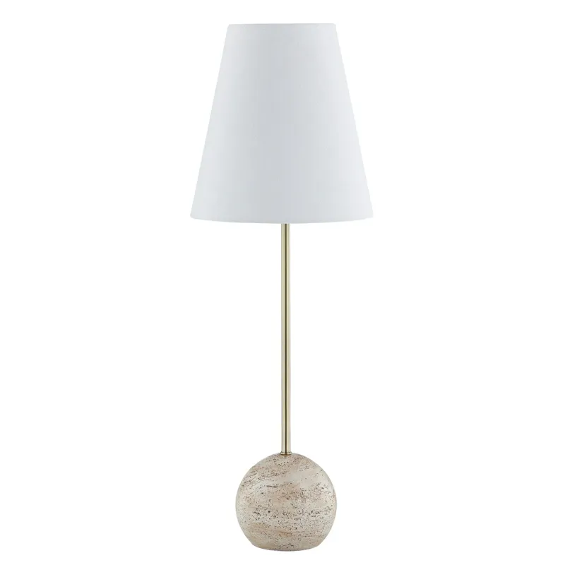 Godwyn Buffet Lamp - Inspired by the timeless elegance of Italian interiors, our handcrafted lamp embodies the beauty of travertine stone, evoking a warm and luxurious ambiance. Its faux travertine sphere base, long slim cylinder neck, and simple white linen tapered drum shade add a touch of sophistication to any space. Elevate your space with this sleek and beautiful lamp.
