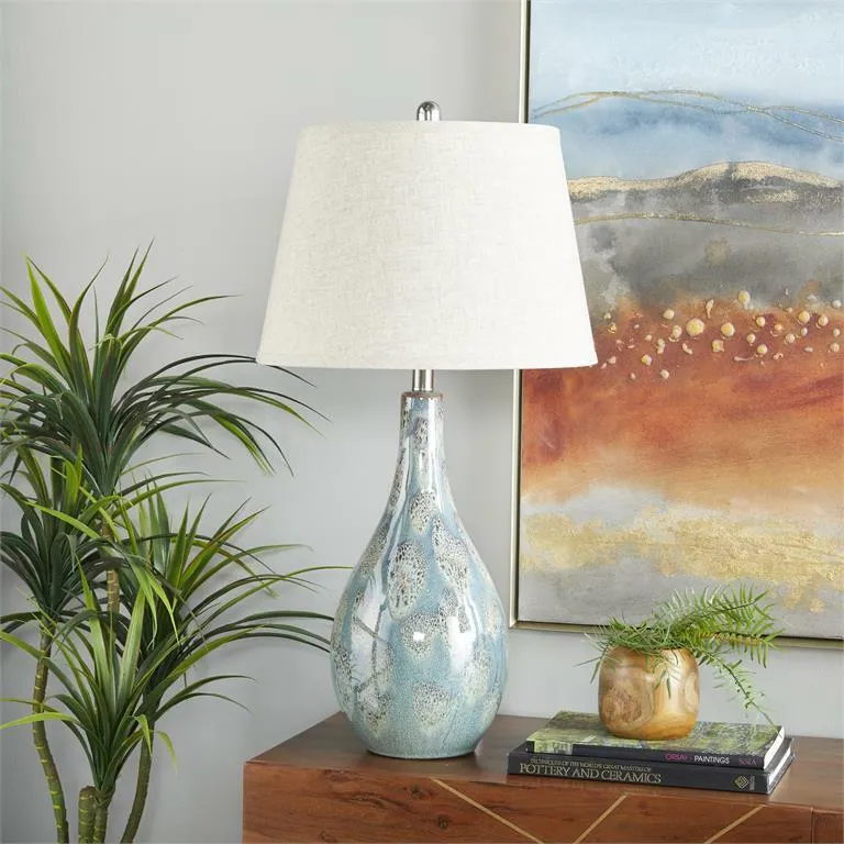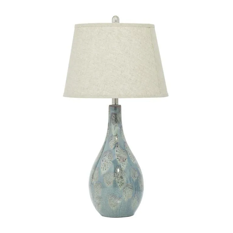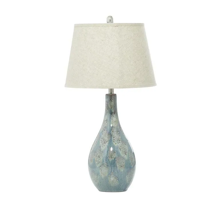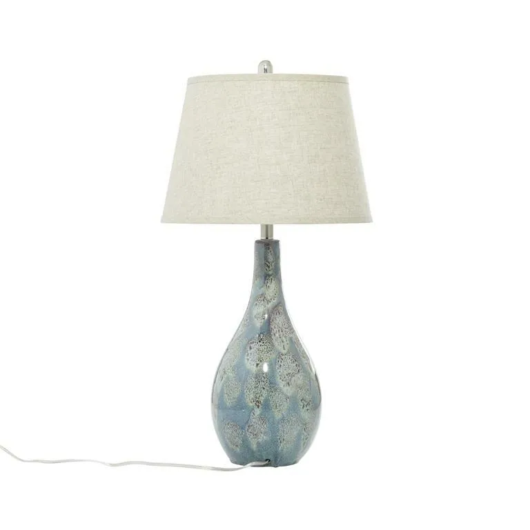 Both contemporary and coastal styles, this ceramic round table lamp has a vase silhouette and multi layered glazes creating a speckled gradient blue with beige and black feather pattern throughout its body. The top is tapered and has a rich dusty blue hue that gradually spreads out into speckled dusty blue and beige throughout the round base. Texture and style from the beige and black feather like pattern adds dimension, while the solid white linen tapered drum shade adds soft luminosity to your table or shelf. Designed with black rubber stoppers at the base that prevent scratching furniture and table tops, as well as sliding around. Takes one 100W E26/Medium standard bulbs. This item has a 63” cord length. Suitable for indoor use only. This ceramic table lamp has a linen drum shade. This table lamp powers via an on/off switch. This item comes shipped in one carton.