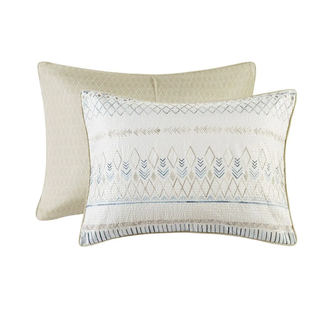Soft and lightweight, the Madison Park Fraser comforter set brings a Southwest inspired touch to your bed. A diamond print in soft blue and taupe colors adorns the light beige face, while a taupe diamond print on the reverse adds a complementary farmhouse look. This set includes a comforter, 2 shams, and 2 decorative pillows with tassels or fringe to tie back into the bedding. This reversible comforter also features an antimicrobial treatment to help reduce the growth of odor causing bacteria and keep the fabric lasting longer. This set is machine washable in a large capacity commercial washer/dryer for best care.