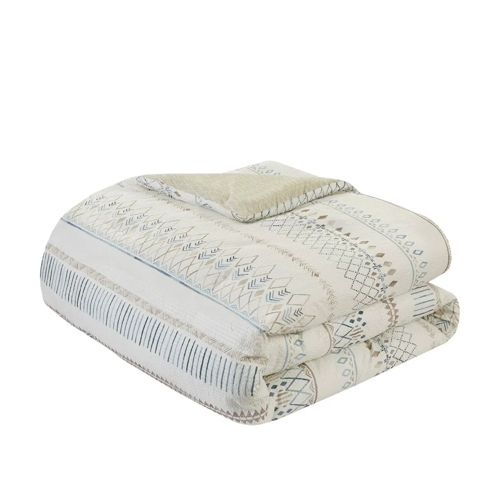 Soft and lightweight, the Madison Park Fraser comforter set brings a Southwest inspired touch to your bed. A diamond print in soft blue and taupe colors adorns the light beige face, while a taupe diamond print on the reverse adds a complementary farmhouse look. This set includes a comforter, 2 shams, and 2 decorative pillows with tassels or fringe to tie back into the bedding. This reversible comforter also features an antimicrobial treatment to help reduce the growth of odor causing bacteria and keep the fabric lasting longer. This set is machine washable in a large capacity commercial washer/dryer for best care.