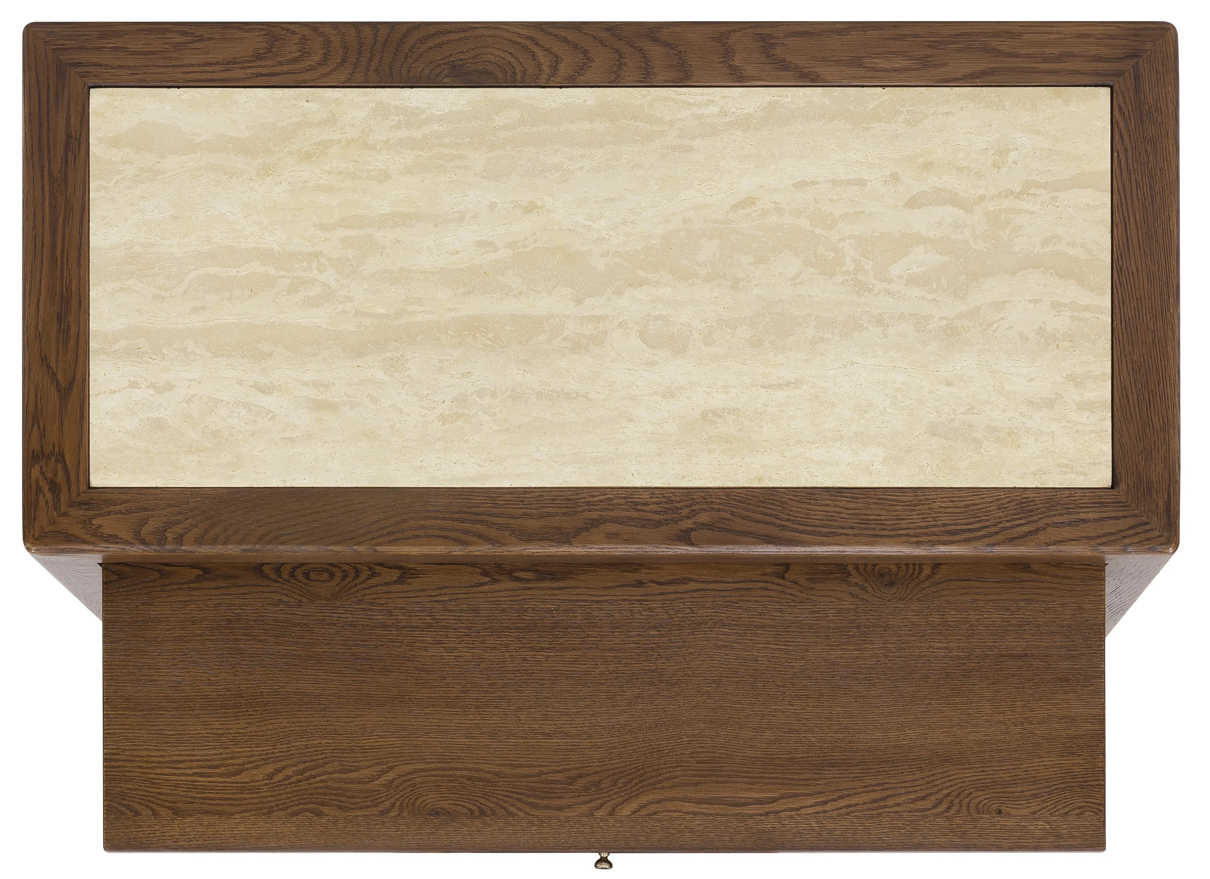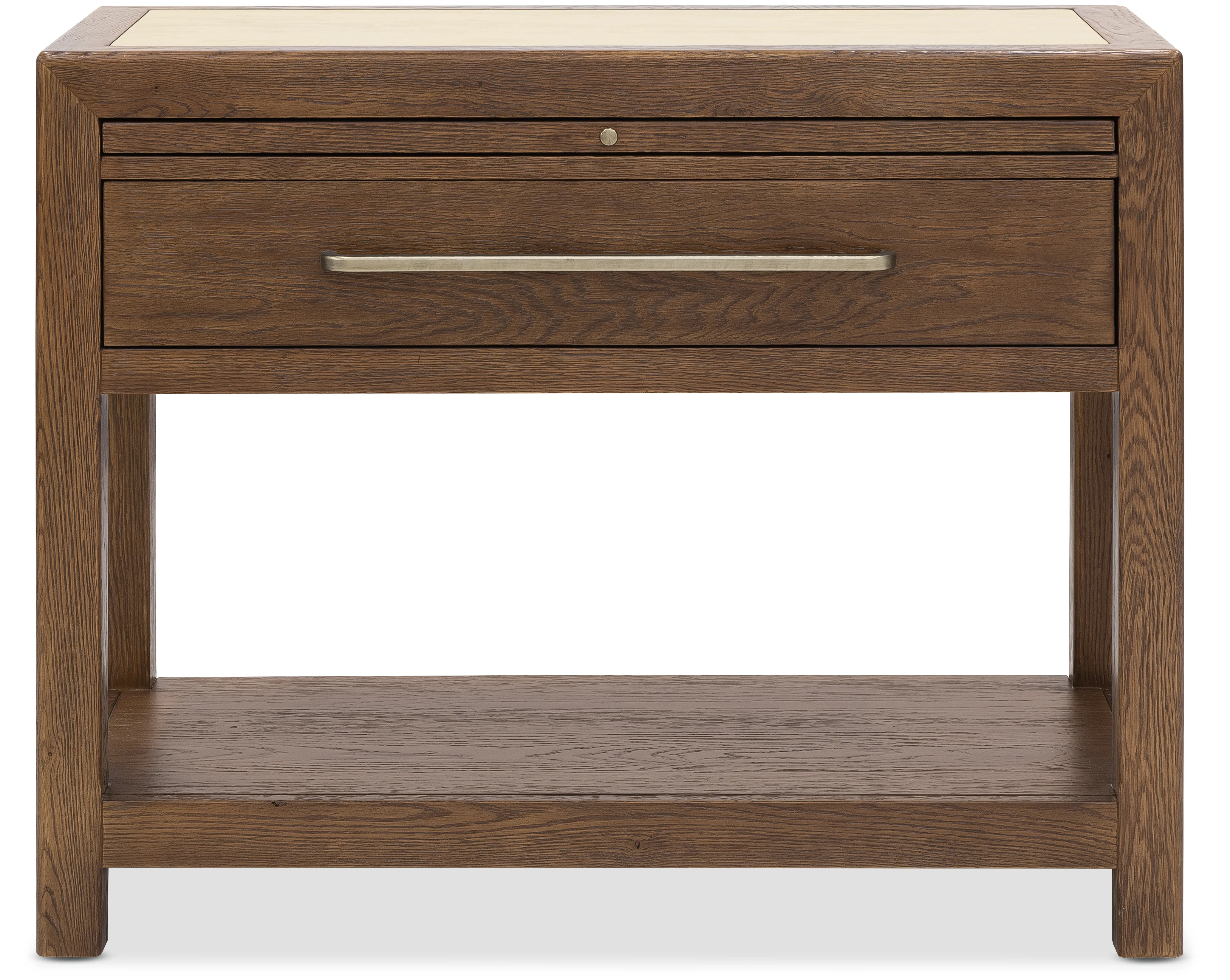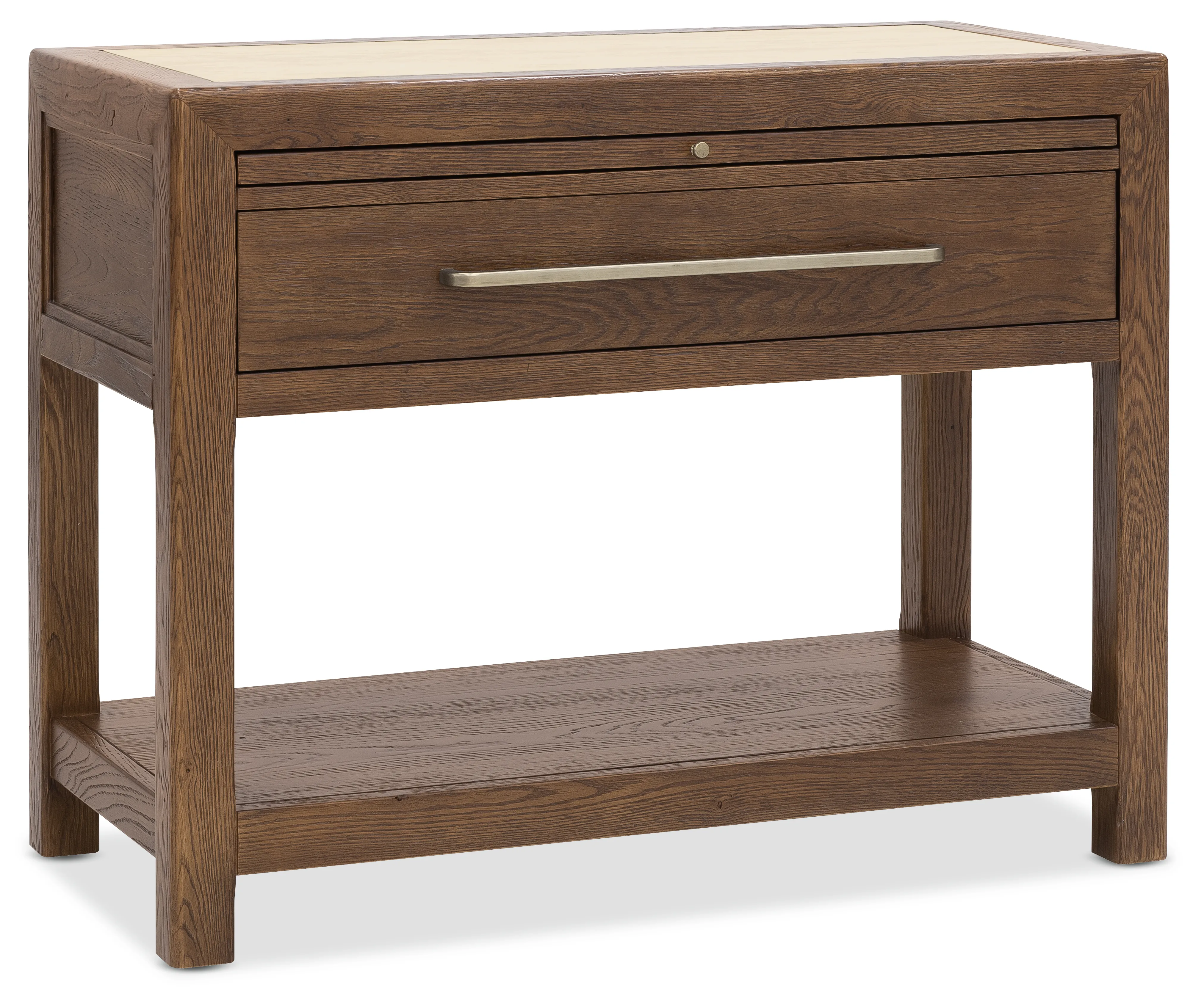 The Driftwood One-Drawer Nightstand with Stone brings refined functionality and natural texture to the bedroom. Crafted from oak solids and veneers, it features a distinctive stone top that adds durability and an elevated material contrast. A self-closing drawer offers convenient bedside storage, complemented by a pullout tray for added surface space and a fixed bottom shelf for books or display. Finished in Worn Saddle, a deep, burnished tone inspired by the supple leather of well-loved armchairs and hand-tooled heirlooms the piece exudes warmth and character. Custom casted bar pull hardware adds a tailored touch, while the overall design reflects a thoughtful balance between heritage craftsmanship and contemporary versatility. The Driftwood collection reveals a rich depth of texture and a timeworn patina, celebrating the beauty of naturally aged materials.