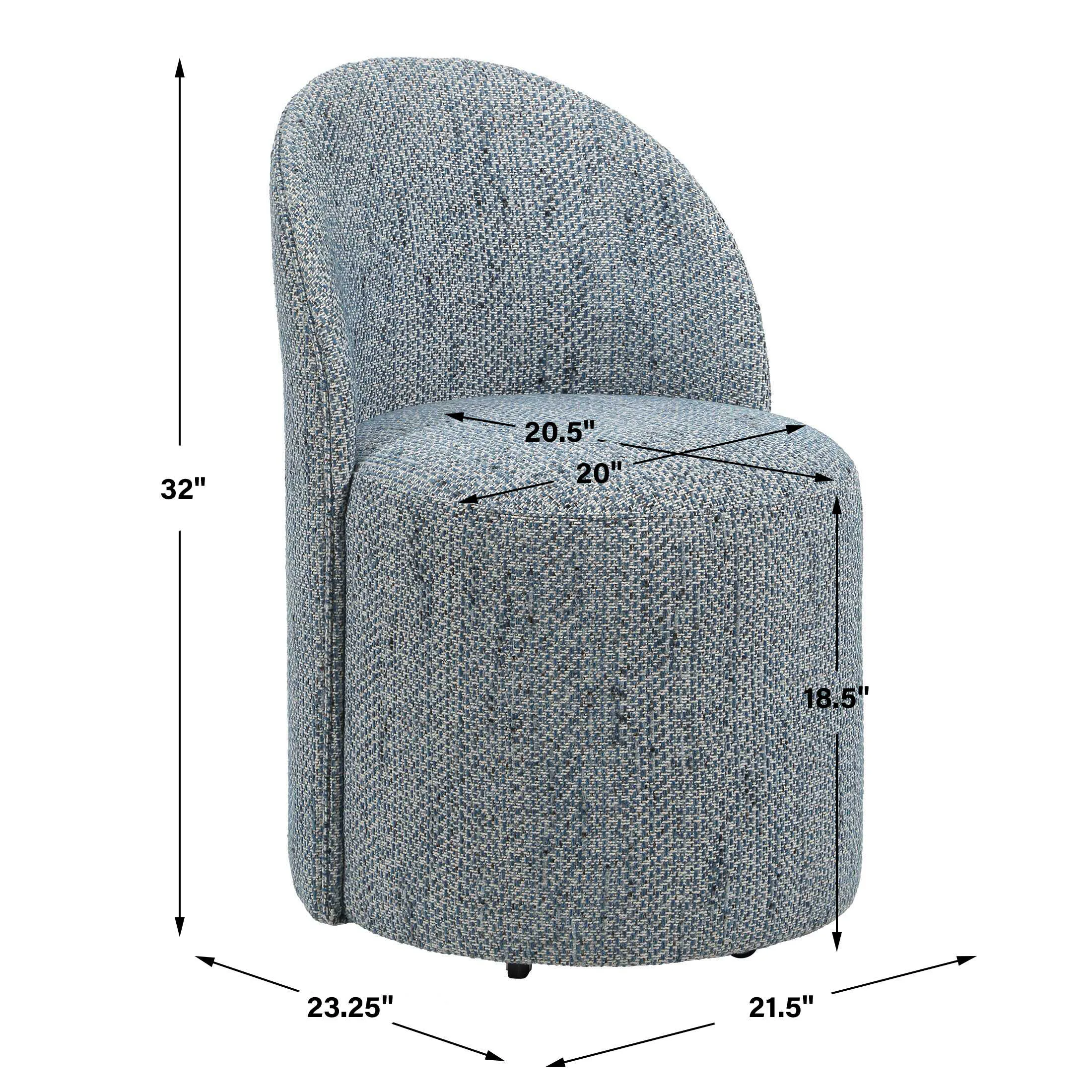 Inspired From Classic Vanity Seating But Proportioned For Dining, The Roll With It Chair Features Rolling Casters For Ease Of Use. Its Smooth Lines Are Fully Upholstered In A Textural Woven Chenille In Denim And White Tones.