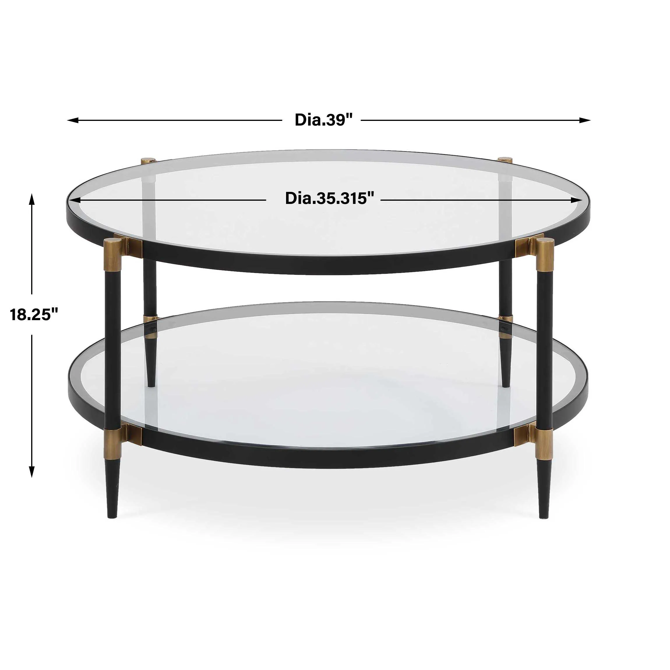 This Elegant Coffee Table Features A Sleek Black Iron Frame With Sophisticated Gold Accents. It Includes Two Tempered Glass Shelves For A Light And Airy Feel.